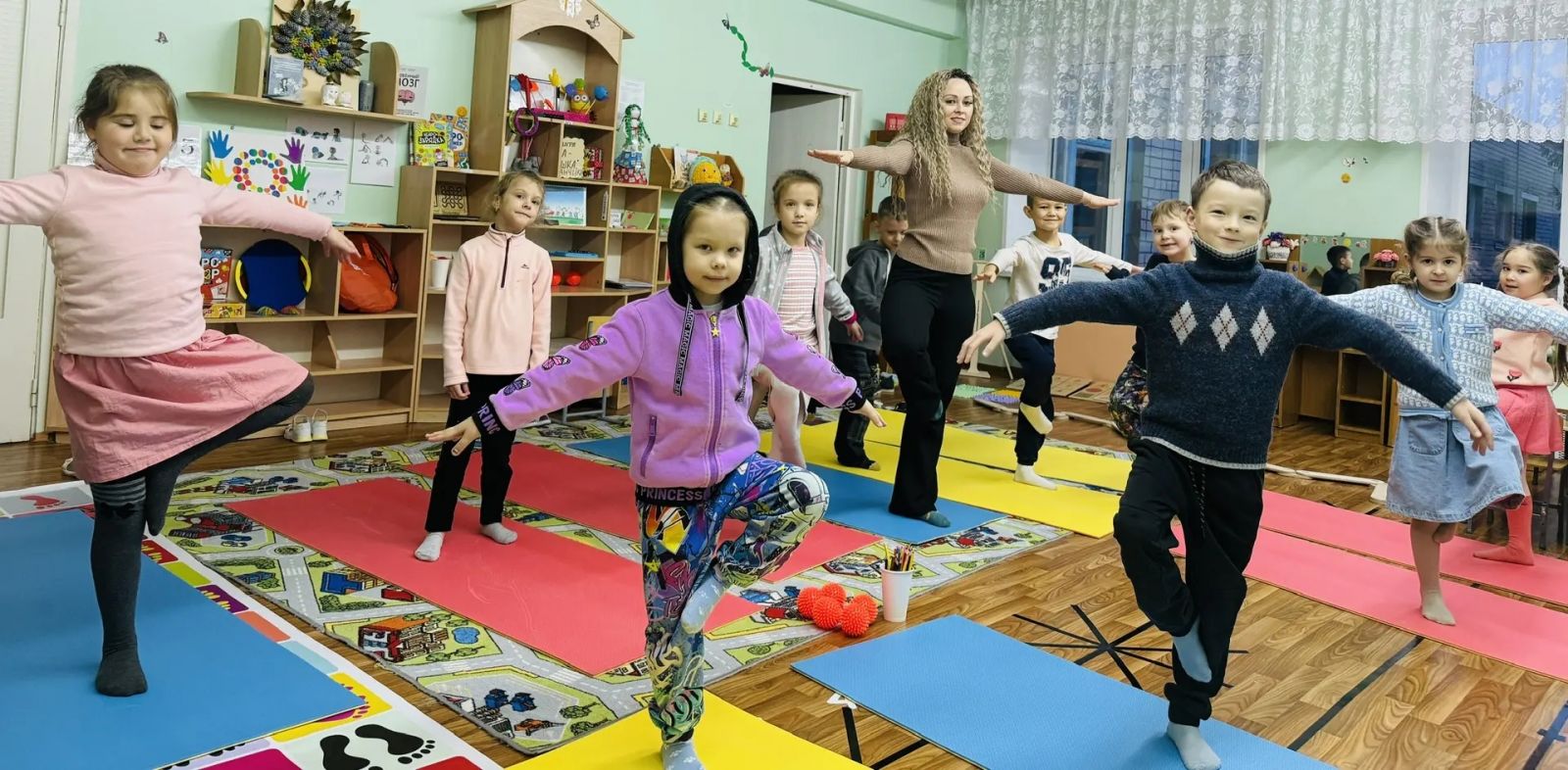 гимнастикой в клубе "Здоровячок". Ребята старательно выполняют упражнения.