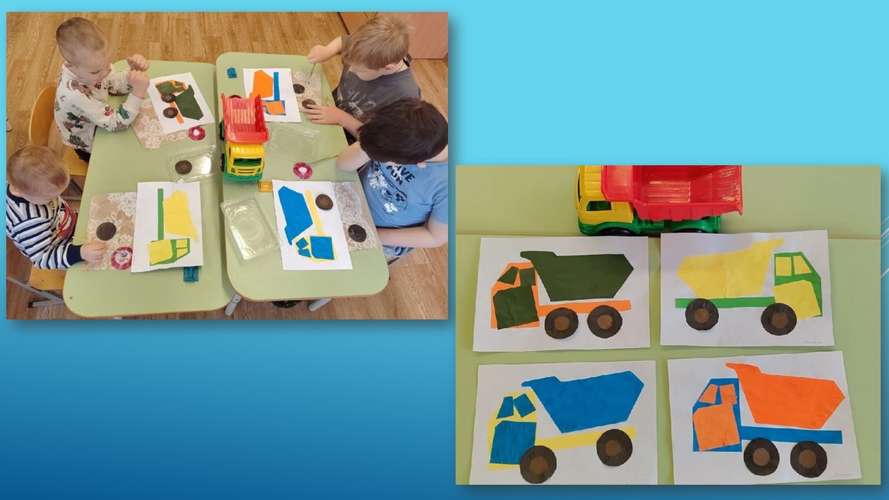 Воспитанники третьей группы ярко и красочно выполнили аппликацию на тему "Наш КамАЗ ", передав в своих работах радость нашему автомобилю.