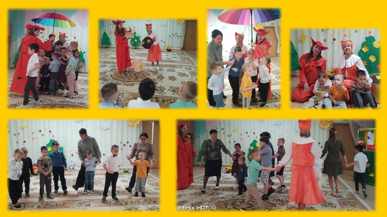 А каким сюрпризом стало появление гостей! К нам заглянула шаловливая Дождинка и сама хозяйка праздника — прекрасная Сюмбеля. Дождинка подарила всем детям смеющиеся капельки-смайлики, а Сюмбеля — замечательные творческие подарки.