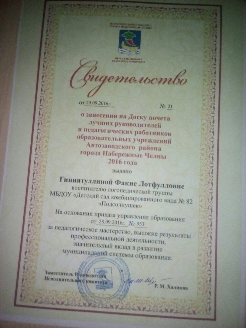 О занесении на Доску почета лучших руководителей и педагогических работников образовательных учреждений Автозаводского района Гиниятуллина Факия Лотфулловна -воспитатель логопедической группы № 6 МБДОУ № 82 "Подсолнушек" за педагогическое мастерство,высокие результаты профессиональной деятельности,значительный вклад в развитие муниципальной системы образования. Свидетельство /upload/storage/org4783/files/17.jpg