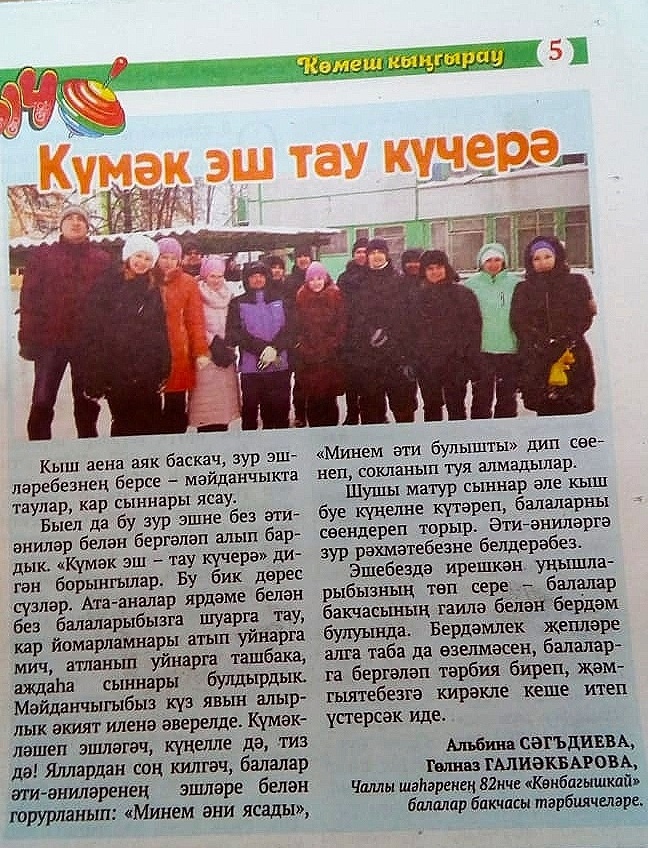 82 нче "Көнбагышкай" балалар бакчасында эшләүче тәрбиячеләр бик актив рәвештә "Көмеш кыңгырау" газетасында мәкаләләрен бастыралар.