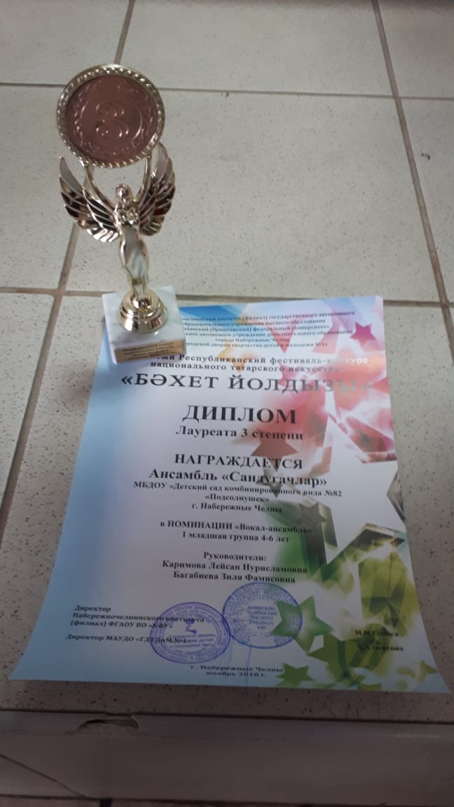 82 нче номерлы балалар бакчасының Каримова Ләйсән Нурисламовна һәм Багабиева Зилә Фамисовна җитәкчелегендә "Сандугачлар" дип исемләнгән ансамбле "Бәхет йолдызы" региональ бәйгедә катнашып III дәрәҗәдә лауреат дипломына лаек булдылар. Котлыйбыз сезне!