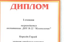 Республиканский конкурс "Первы шаги" лауреат 1 степени воспитанник группы № 1 Королев Гордей Педагог Михайлова С.Ю.