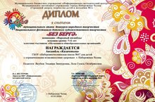 Ансамбль "Казаченька" ГБОУ "Набережночелнинская школа №67" награжден дипломом 2 степени в муниципальном этапе конкурса народного творчества Национального фестиваля детского художественного творчества "Без бергэ" в номинации "Народный ансамбль"