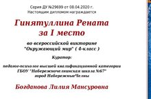 Обучающаяся 4 класса ГБОУ "Набережночелнинская школа № 67" была награждена Дипломом 1 степени за участие во всероссийской викторине по окружающему миру среди обучающихся 1-4 классов.