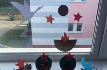 9б и 7а нарисовали своими ладошками «Вечный огонь» к празднику "День Победы"