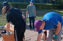 Обучающиеся трудовой бригады приводят в порядок садовый инвентарь.