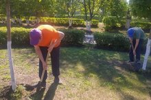 Обучающиеся трудовой бригады окапывают деревья, ведётся благоустройство территории.