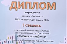 Обучающиеся нашей школы были награждены дипломом 1 степени в городской эколого-краеведческой игровой программе "Зеленая эстафета".Дебердеева Мадина, ученица 7б класса стала победительницей в городском экологическом конкурсе #ECOTHON, который длился весь учебный год.