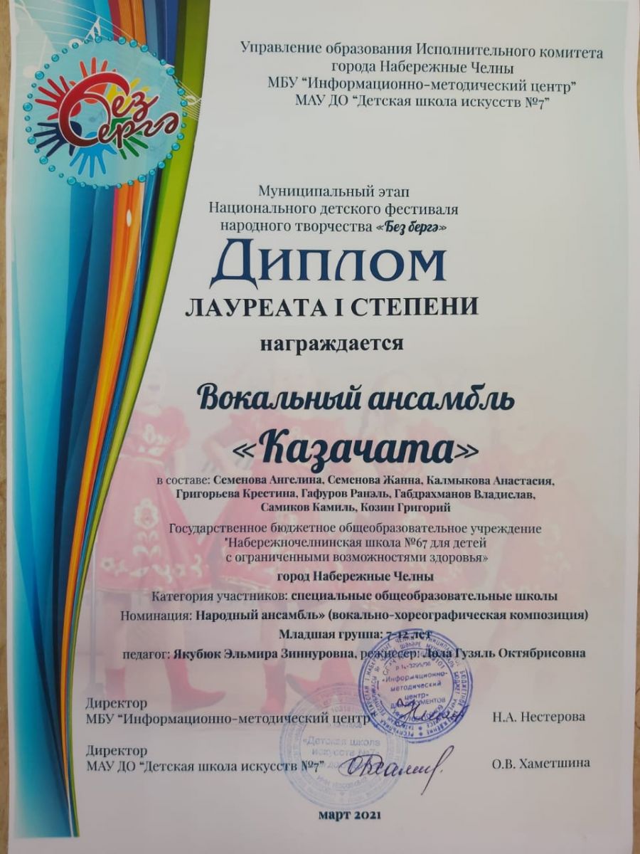 Вокальный ансамбль "Казачата" ГБОУ "Набережночелнинскашкола № 67" - награждены дипломом лауреата 1 степени.