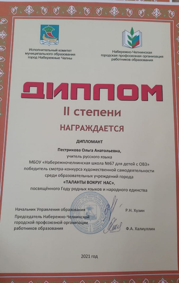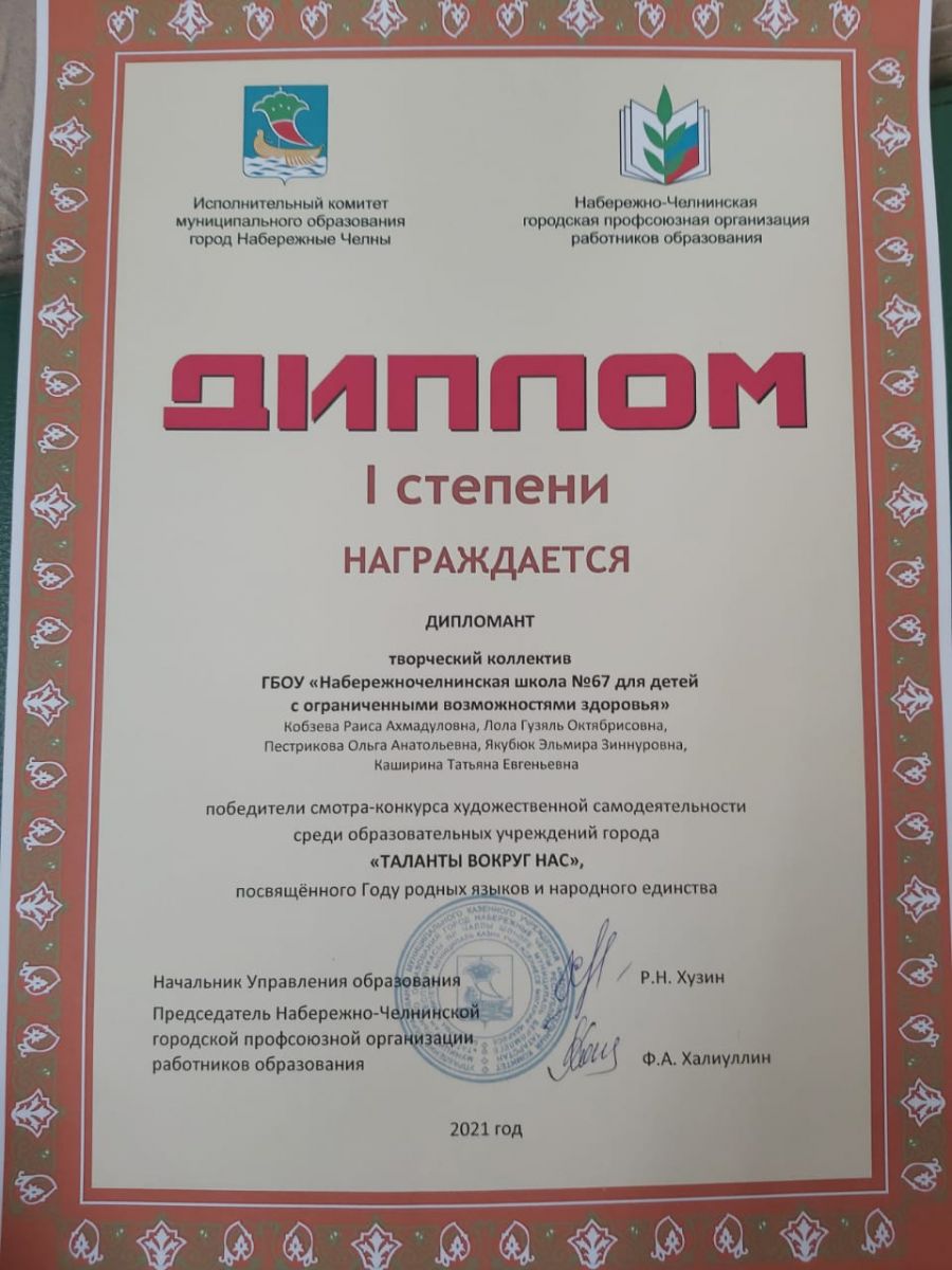 Опубликовано: 23.04.202123.04.2021 года творческий коллектив ГБОУ "Набережночелнинская школа № 67 " стали победителями смотра художественной самодеятельности среди ОУ города "Таланты вокруг нас" посвященный Году родных языков и народному единству .
