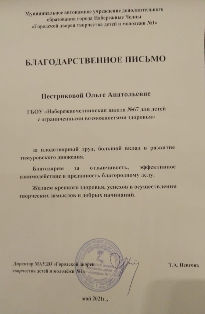Опубликовано: 17.05.202117.05.2021 года в ГДТДиМ 1 подвели итоги работы тимуровских отрядов за 2020-2021 учебный год. Тимуровский отряд "Непоседы" приняли участие в мероприятии. Руководитель отряда Пестрикова Ольга Анатольевна была награждена благодарственным письмом.
