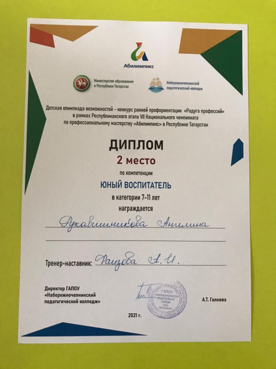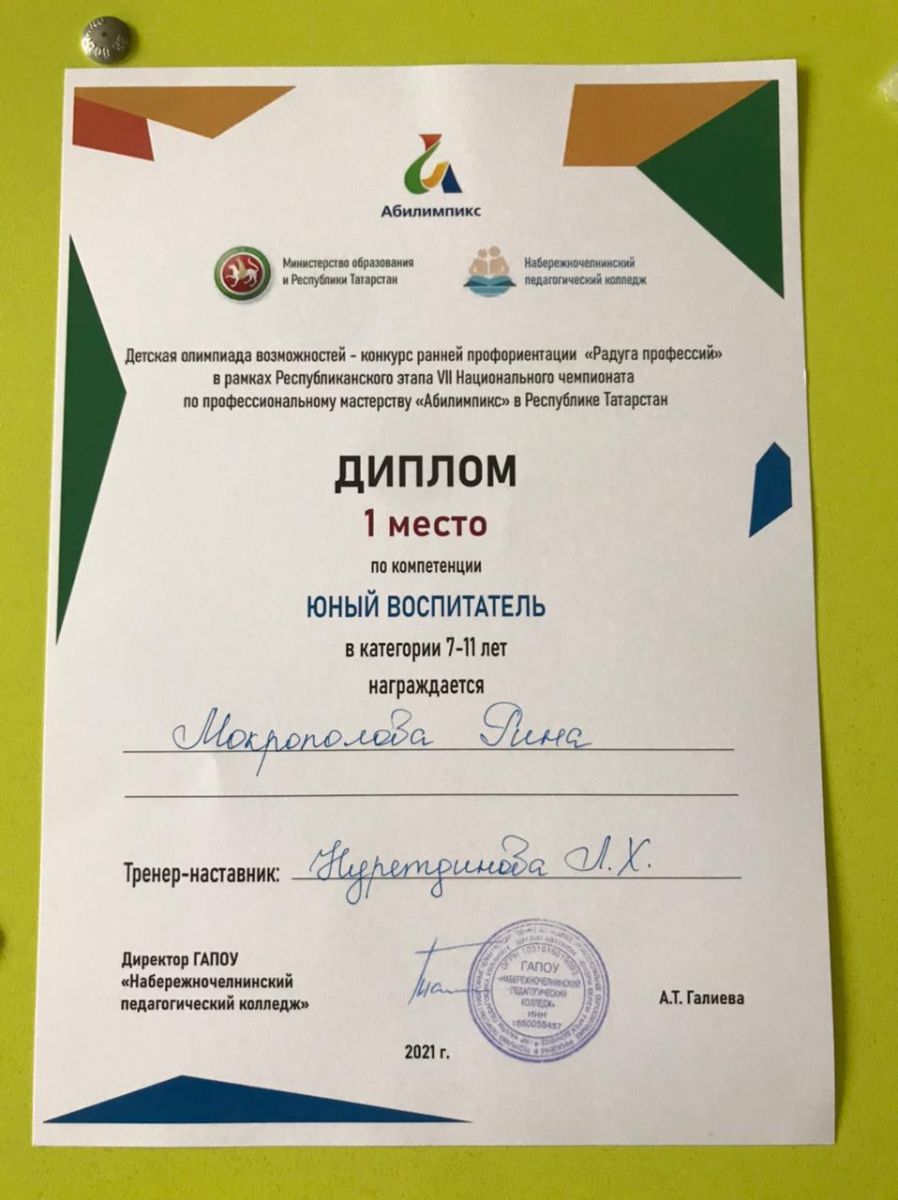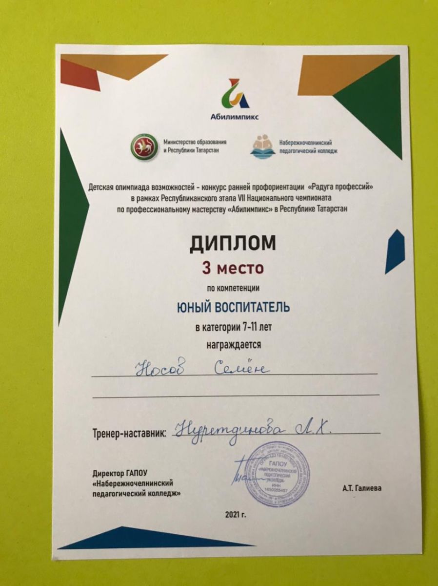 Опубликовано: 24.09.202124 сентября 2021 года в г. Набережные Челны прошел Республиканский этап VII Национального чемпионата по профессиональному мастерству среди лиц с инвалидностью и ограниченными возможностями здоровья « Бэби АБИЛИМПИКС», за честь школы в компетенции "Юный воспитатель" в категории 7-11 лет выступали учащиеся 3 класса - Мокрополова Рина, Носов Семен, Рукавишникова Ангелина (учителя: Нурутдинова Л.Х., Фаизова А.И.) .