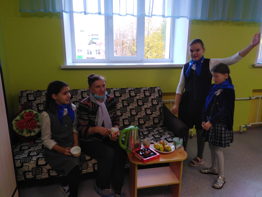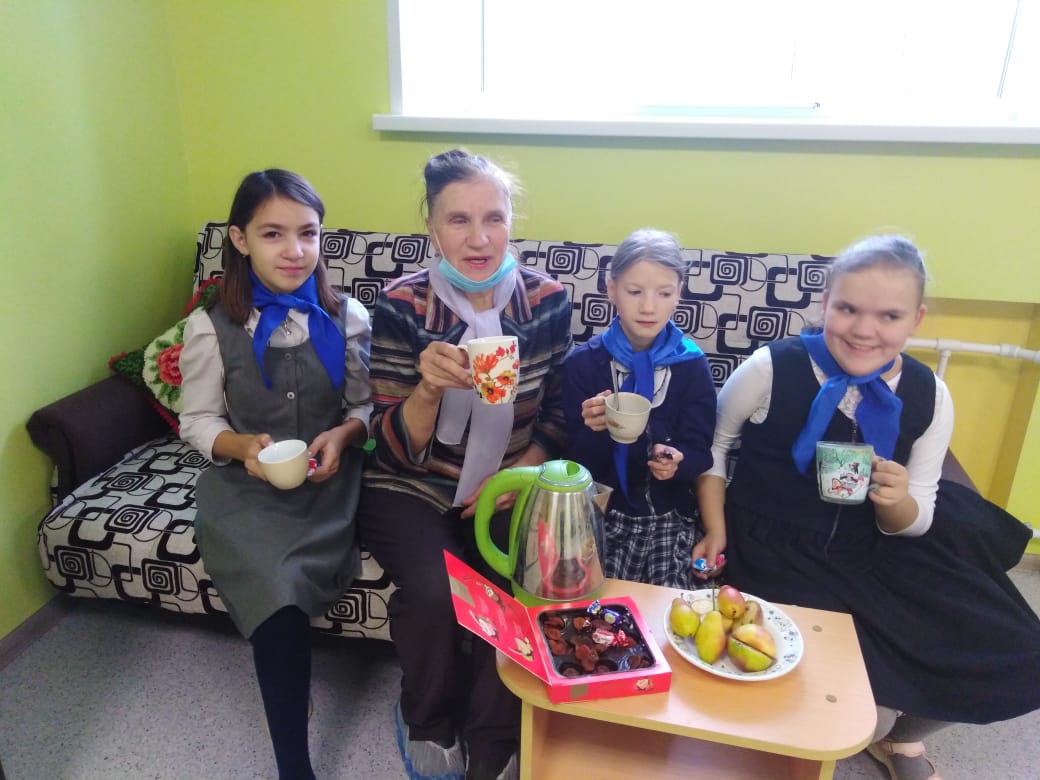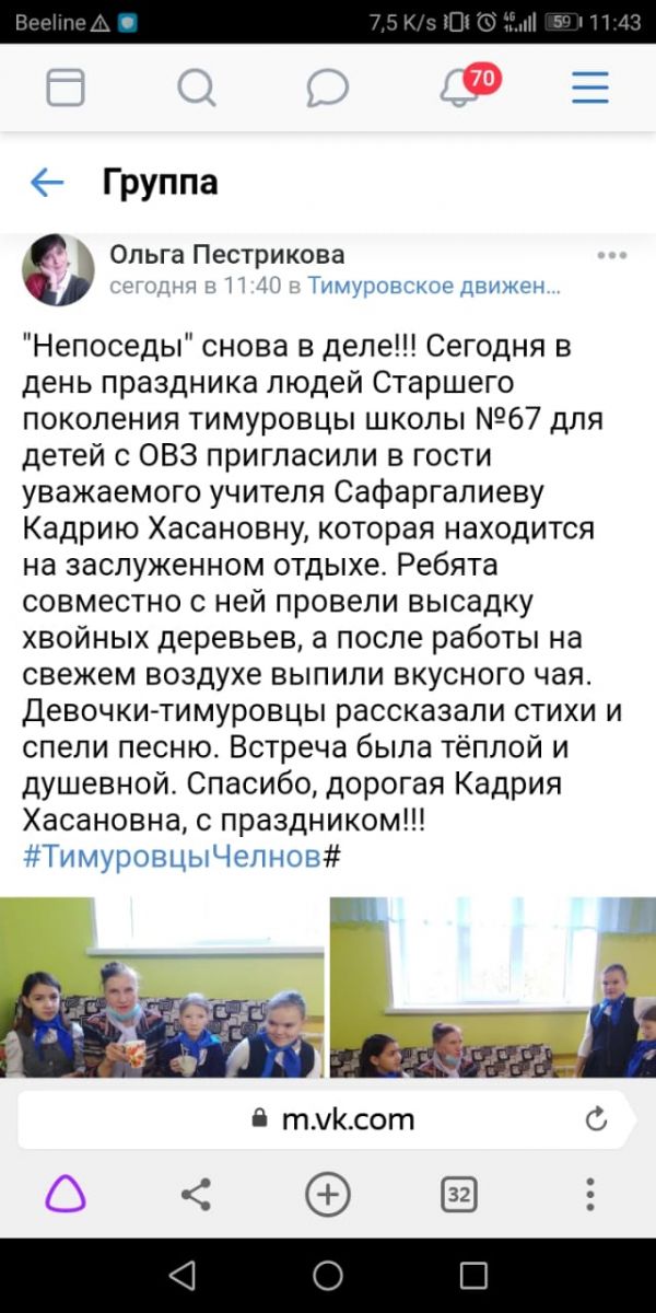 Опубликовано: 01.10.2021"Непоседы" снова в деле !!! Сегодня в день праздника людей Старшего поколения тимуровцы школы № 67 для детей с ОВЗ пригласили в гости уважаемого учителя Сафаргалиеву Кадрю Хасановну, которая находится на заслуженном отдыхе. Ребята совместно с ней провели высадку хвойных деревьев, а после работы на свежем воздухе выпили вкусного чая. Девочки-тимуровцы рассказали стихи и спели песню. Встреча была тёплый и душевный спасибо дорогая Кадрия Хасановна с праздником!!!