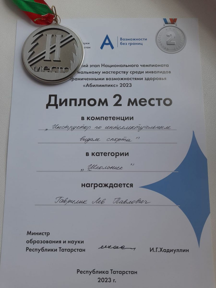 Опубликовано: 16.05.202316 мая 2023 года подвели итоги Регионального этапа Национального чемпионата по профессиональному мастерству среди инвалидов и лиц ограниченными возможностями здоровья "Абилимпикс" 2023, наш обучающийся 8 А класса Гаврилик Лев победил в соревнованиях Абилимпикс по компетенции "Инструктор по интеллектуальным видам спорта" и занял 2 место.