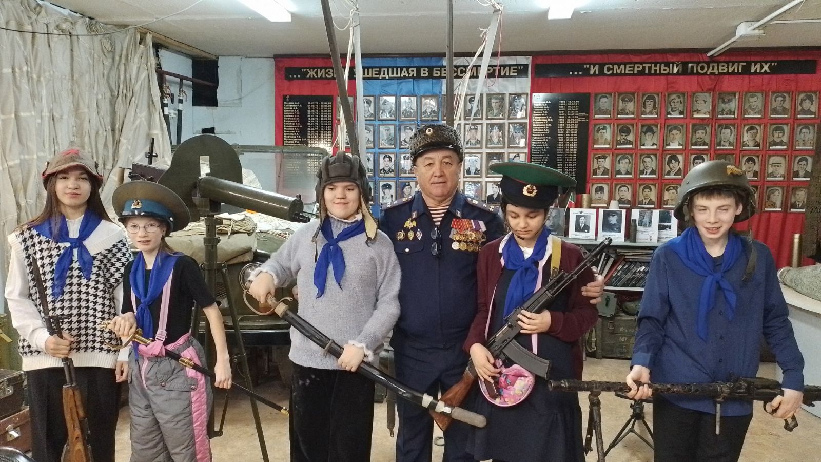 Опубликовано: 12.02.2024В рамках городской акции "День героев Отечества " для участников тимуровского отряда "Непоседы " ГБОУ НАБЕРЕЖНОЧЕЛНИНСКАЯ ШКОЛА №67 стало доброй традицией встреча с замечательным человеком и истинным гражданином своей страны - полковником в отставке Мокану Георгием Николаевичем. Тимуровцы навестили его в музее Герат Полевая почта, ведь каждая встреча с Георгием Николаевичем интересна, познавательна, заряжает патриотизмом и силой духа. Тимуровцы услышали рассказы из военной службы героя, поздравили с наступающим днем Защитника Отечества.