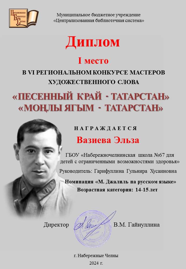 Опубликовано: 28.02.2024В рамках мероприятий, посвященных Международному дню родного языка учащаяся 8а класса Вазиева Эльза приняла участие в VI региональном конкурсе мастеров художественного слова «Песенный край- Татарстан», посвященном творчеству поэта-героя Мусы Джалиля и заняла I место. Эльза выступила со стихотворением Мусы Джалиля «Платочек».