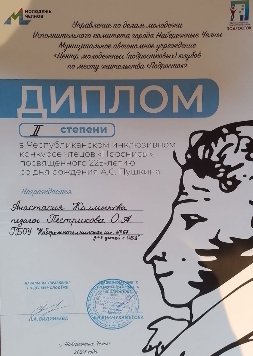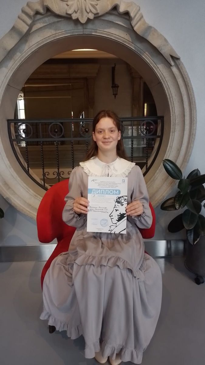Опубликовано: 29.04.2024Сегодня 29 апреля в малом зале театра Мастеровые состоялся финал Республиканского конкурса чтецов "Проснись!", посвящённого 225-летию со дня рождения А.С.Пушкина. Учащаяся 9а класса Анастасия Калмыкова читала "Письмо Татьяны к Онегину ". Её выступление было трогательным и проникновенным, образ героини Настя передала прекрасно!!! С почётным и заслуженным дипломом II степени, Настенька!!!