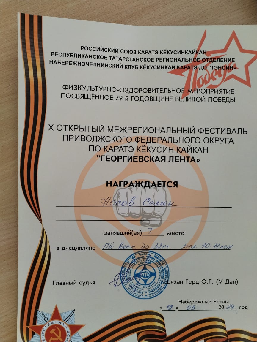 Опубликовано: 13.05.2024Обучающийся 5б класса Носов Семён занял 1 место в Х открытом межрегиональном фестивале Приволжского федерального округа по каратэ кекусин кайкан "Георгиевская лента". Поздравляем!