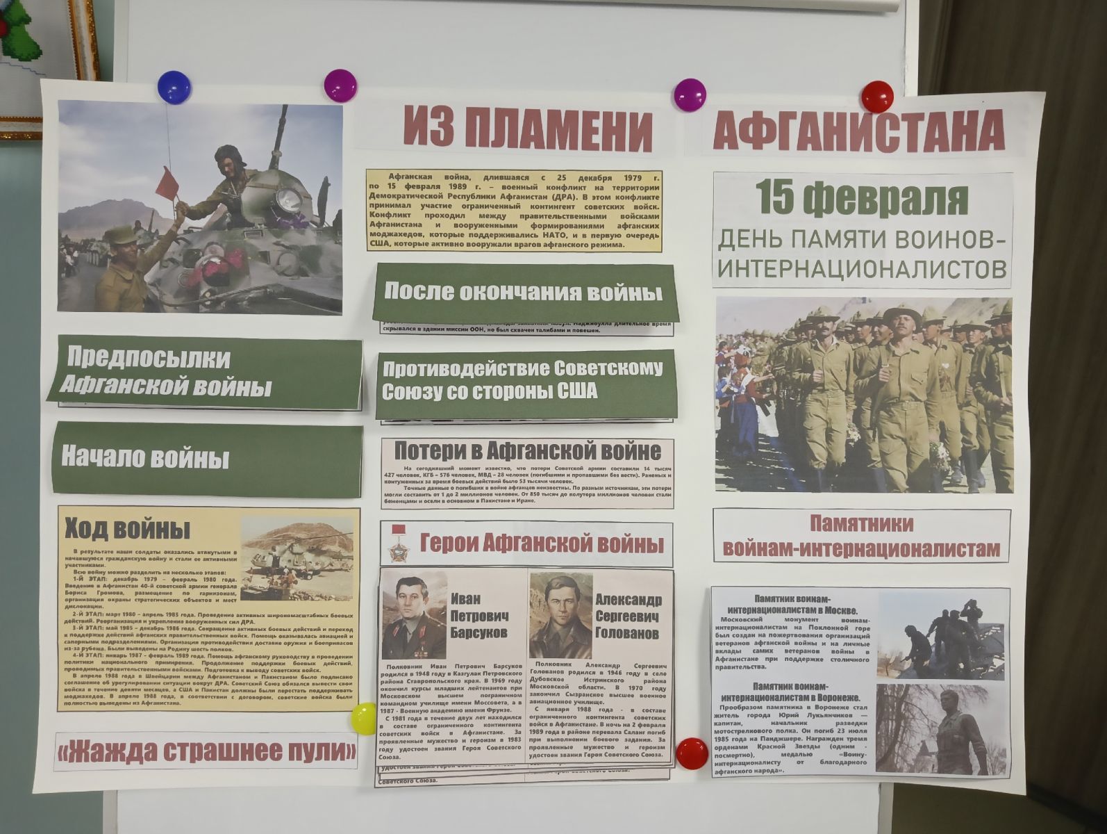 Обучающимися старших классов, совместно с библиотекарем Ольгой Николаевной Кудимовой, была подготовлена стенгазета "Из пламени Афганистана". Готовя материал к стенгазете Елена Владимировна напомнила старшеклассникам, что 15 февраля вспоминают не только ветеранов войны