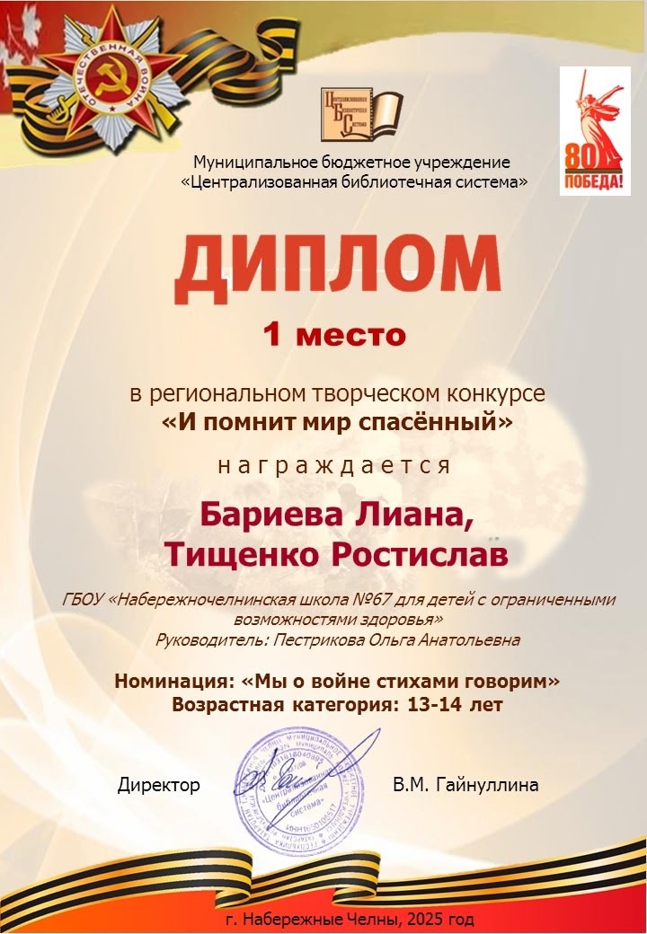 Обучающиеся нашей школы Тищенко Ростислав и Бариева Лианы приняли участие в региональном творческом конкурсе " И помнит мир спасенный", посвященном 80-летию Победы в Великой Отечественной войне. Ребята проникновенно прочитали стихотворение Булата Окуджавы "До свидания, мальчики!", составив замечательный поэтический дуэт! По решению жюри номер заслужил почётное 1 место!!! Браво, Лиана и Ростислав! Поздравляем!!!