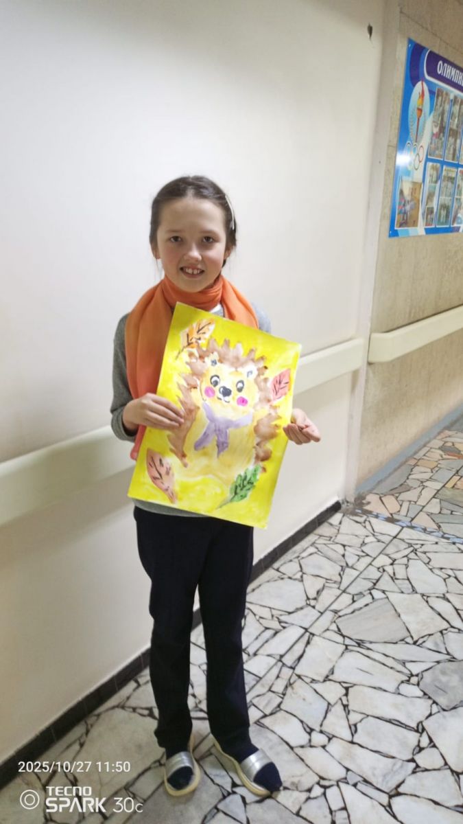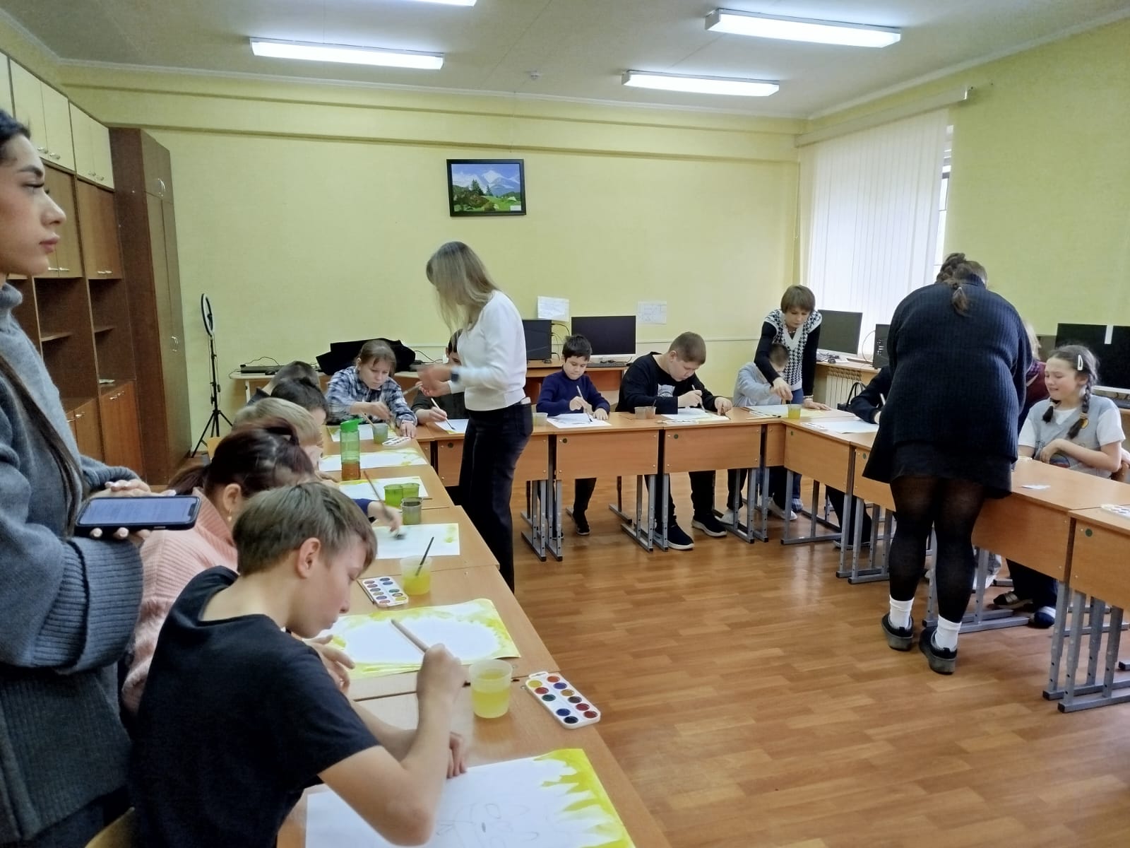 Опубликовано: 27.10.2025Развлекательно – познавательная программа. Мастер-класс «Палитра осени». Сегодня 27 октября ученики 1-4-х, 5б, 6а классов школы № 67 посетили мастер- класс "Палитра осени" в ГДТДиМ. Желающих было так много, что организаторы провели мастер- класс сразу в двух кабинетах. Дети с увлечением рисовали акварелью ёжиков на осенней полянке. Работы получились чудесные, ребята остались довольные!