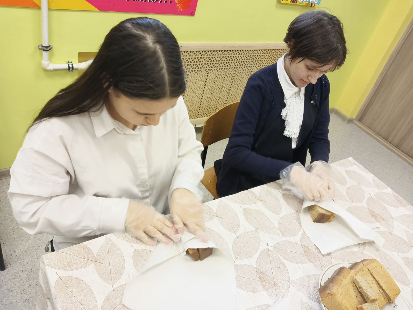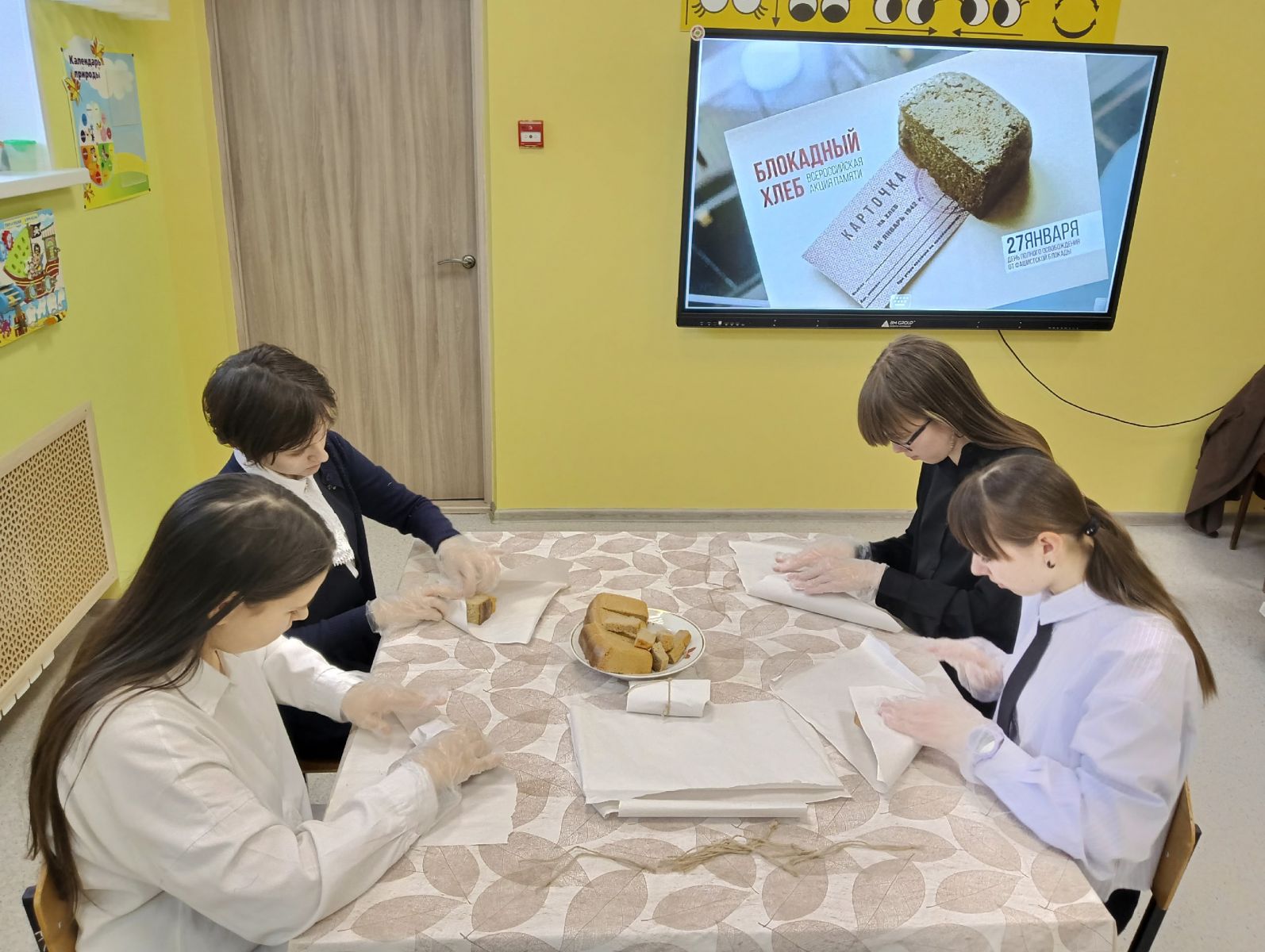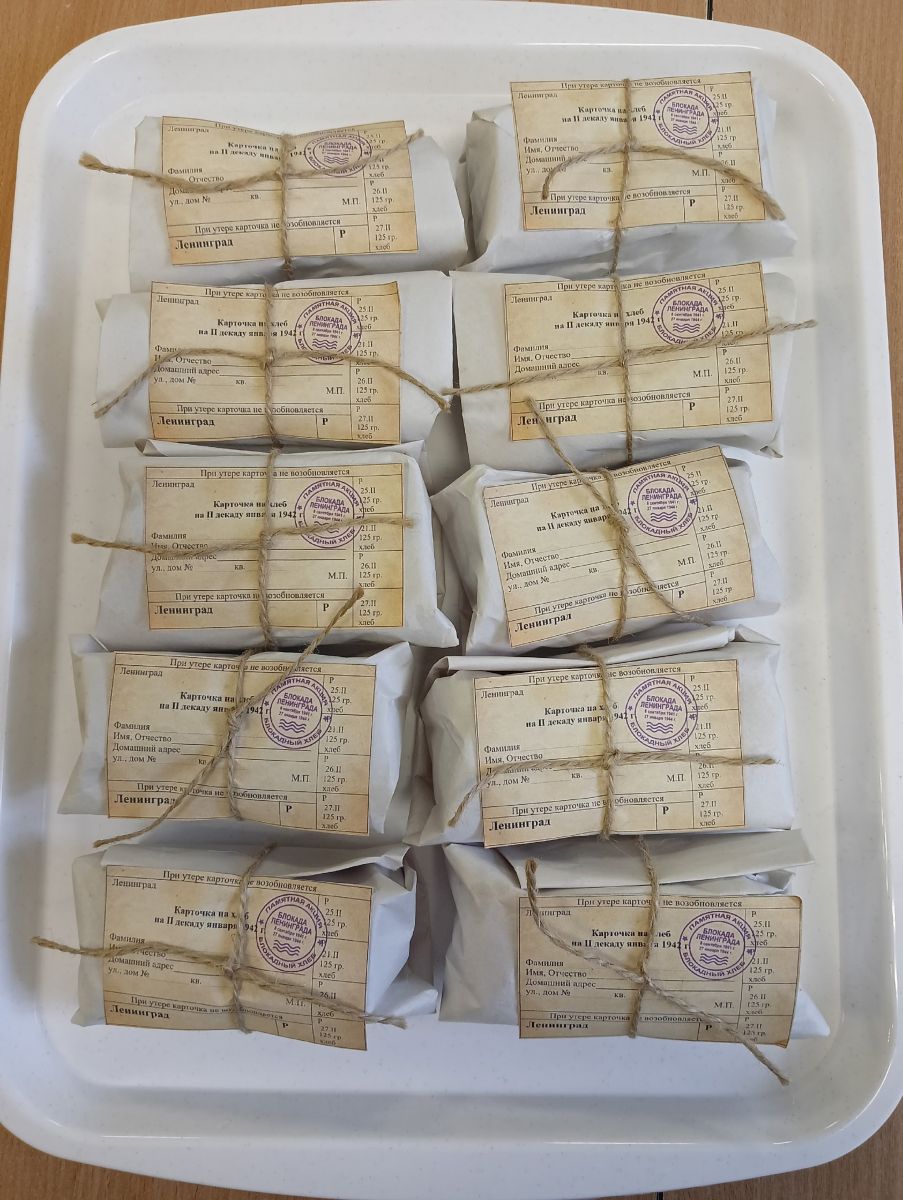 С обучающимися старших классов мы подготовили и раздали родителям наших учеников сверток с кусочком чёрного хлеба и блокадную карточку на норму хлеба в день, как символом мужества и героизма Ленинградцев.