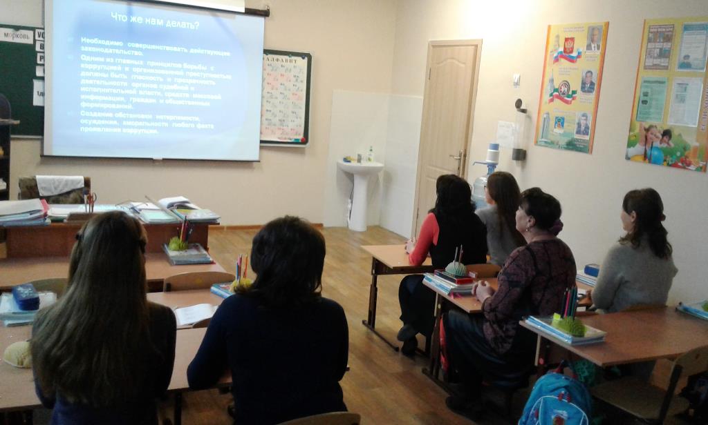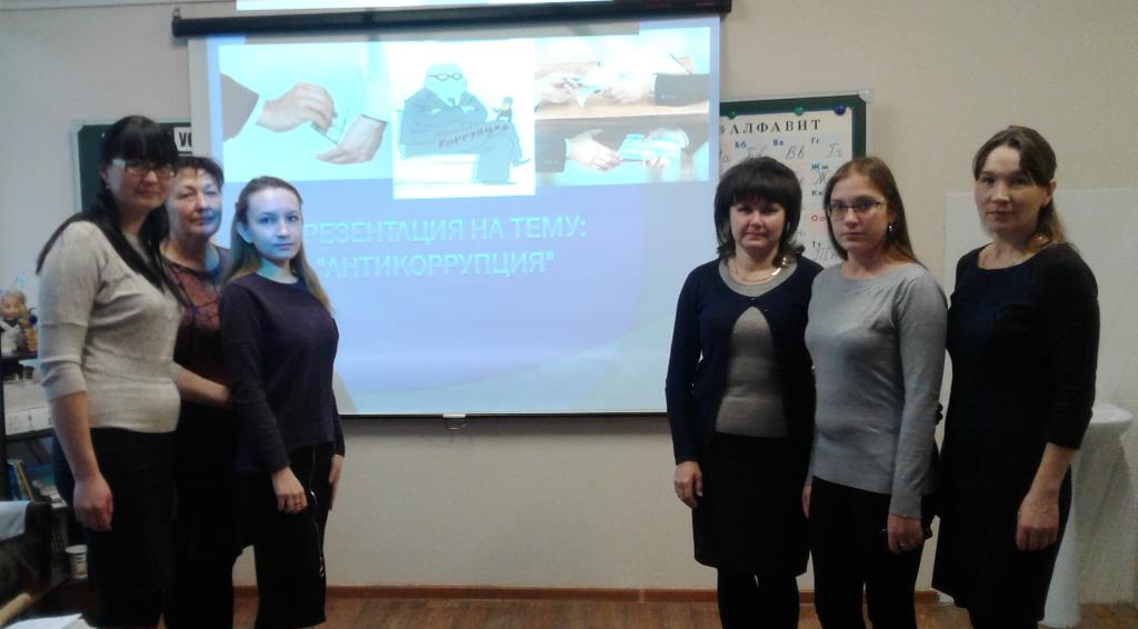 Опубликовано: 17.11.2017Учителями и воспитателями начальных классов были проведены мероприятия, приуроченные к Международному дню борьбы с коррупцией. 17.11.2017 г. состоялся круглый стол на тему «Коррупции нет!». Руководитель МО «Начальные классы» Абдрахманова А.А. подготовила презентацию «Антикоррупция» и провела беседу с учителями о борьбе с коррупцией.