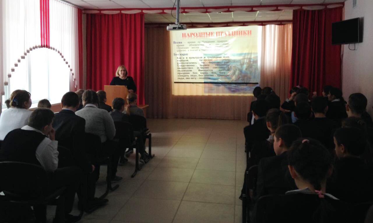 Опубликовано: 13.02.2018По плану мероприятий, посвященных Международному дню родного языка, сегодня в актовом зале прошел единый классный час «Татарстан – любимый край» для учащихся 5-9 классов. Цель: развивать кругозор обучающихся, показать значение родины в жизни каждого человека, способствовать воспитанию патриотизма, знакомство с традициями и обычаями.