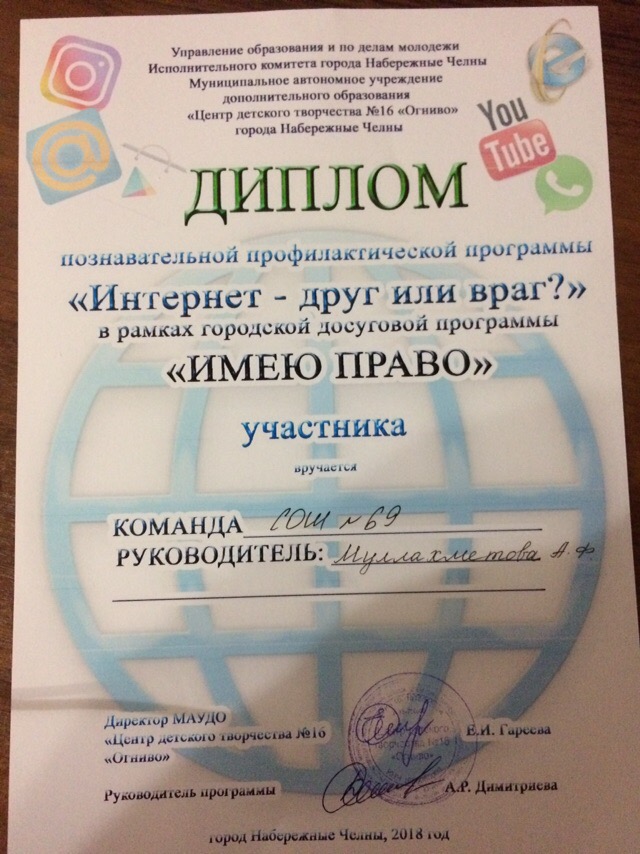 Опубликовано: 09.10.201809.10.2018 г., в рамках городской досуговой программы «ИМЕЮ ПРАВО», учащиеся школы №69 приняли активное участие в познавательной профилактической программе «Интернет – друг или враг?».