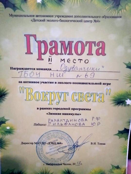 Опубликовано: 28.12.201827 декабря 9 классы под руководством Гильфановой Ю.Р. и Галялтдиновой Г.Ф. приняли участие в эколого-познавательной игре "Вокруг света", заняв почётное 2 место.