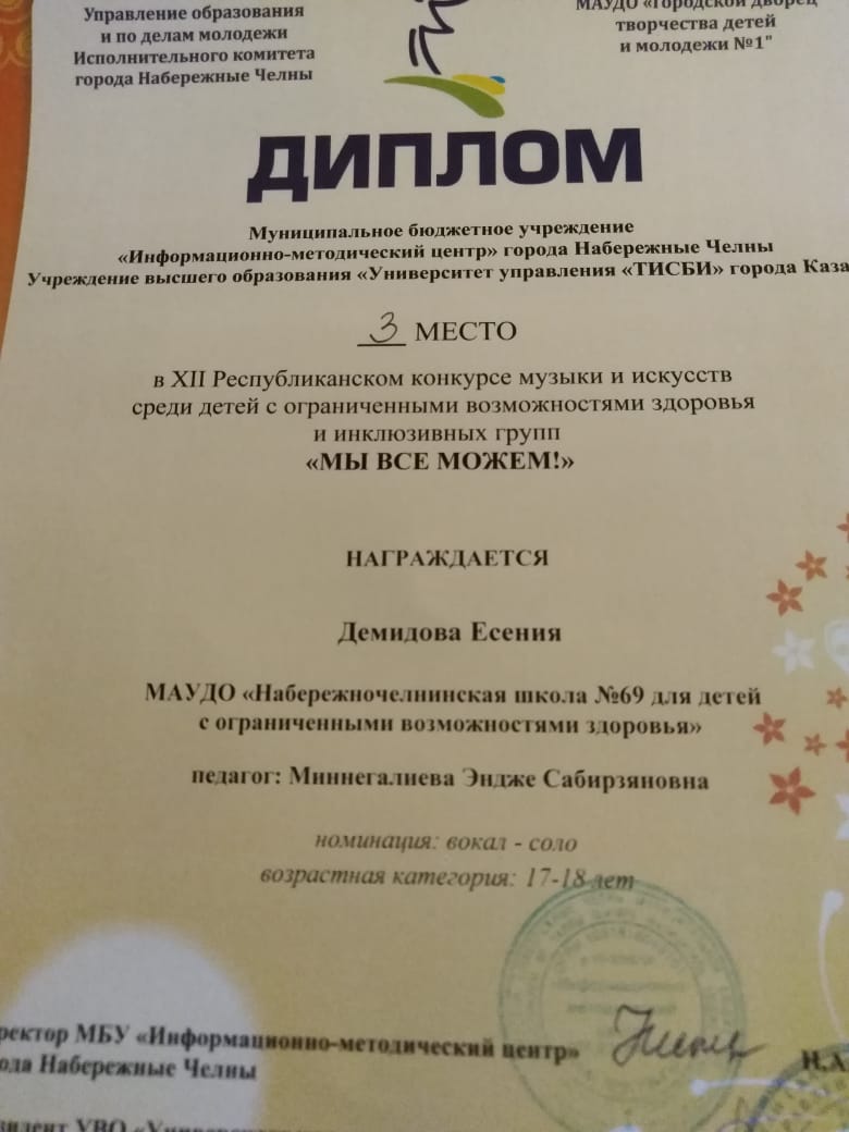Опубликовано: 29.03.2019Учащиеся школы Тюрьмина Ангелина и Демидова Есения заняли призовые места в XII Республиканском конкурсе музыки и искусств среди детей с ОВЗ и инклюзивных групп "Мы всё можем".