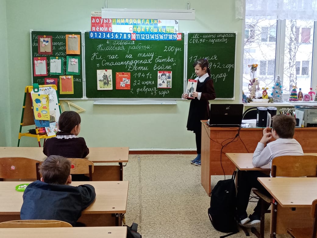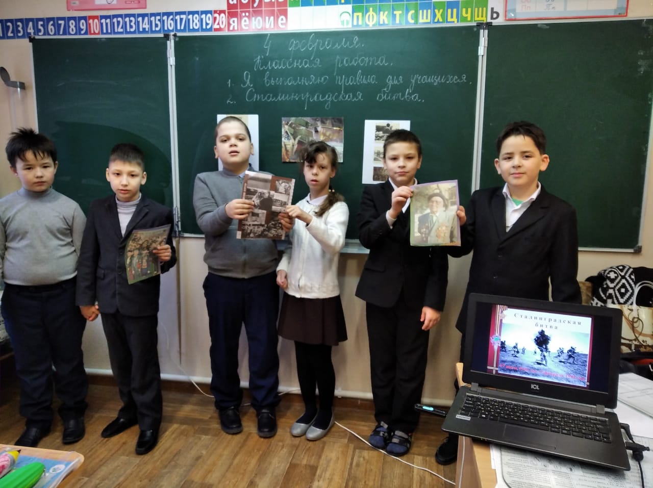 4.02.2020 Учителями начальных классов был проведен единый классный час на тему: «Сталинградская битва». Учащимся рассказали о страшных событиях, которые пришлось пережить нашему народу. Были показаны презентации, фильмы, организована выставка детских работ.
