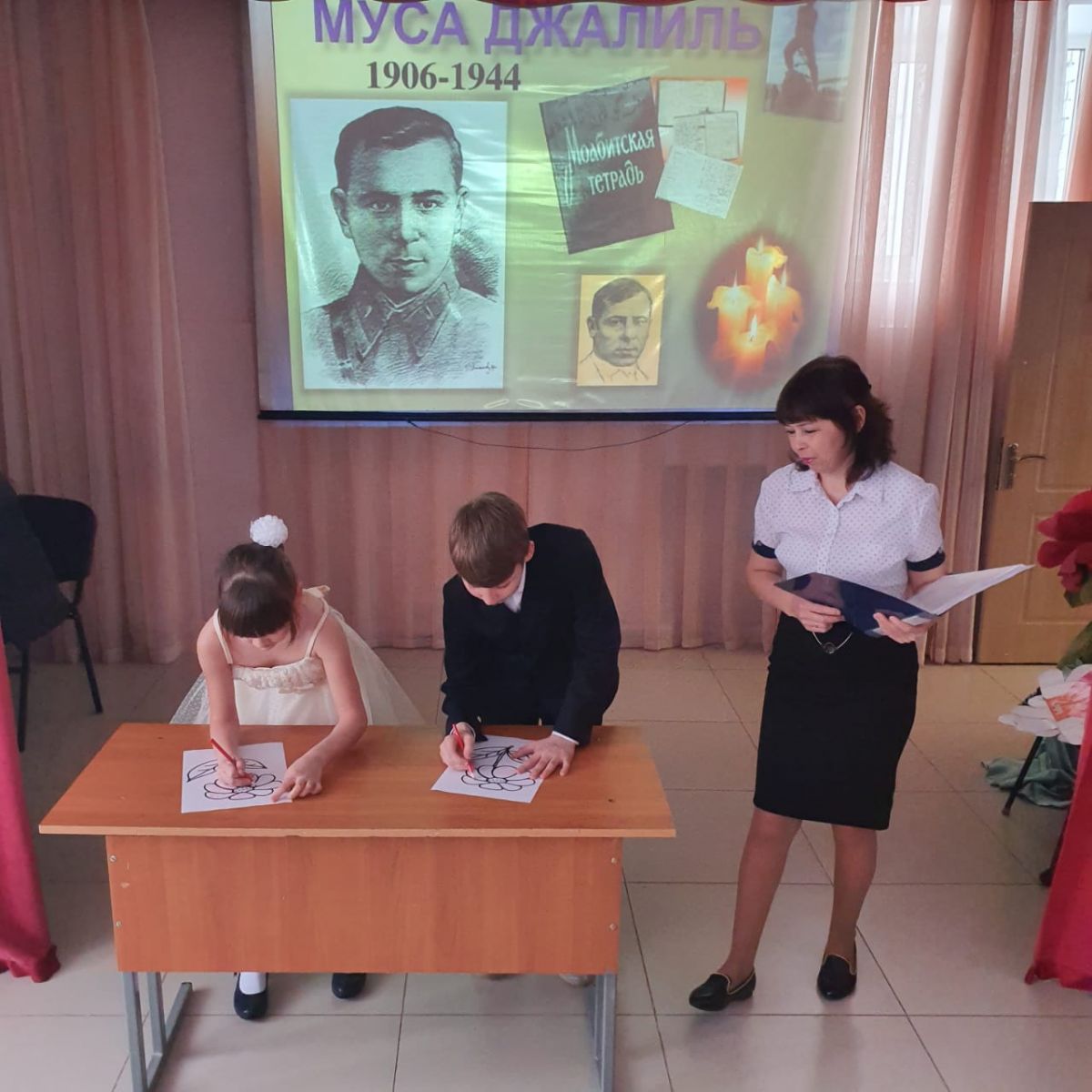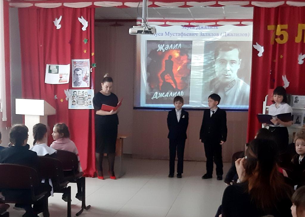 Опубликовано: 19.02.2020В честь дня рождения поэта, 19.02.2020 библиотекарем школы Сабирзяновой Р.И. и воспитателем Хасановой А.Х. для учеников начальных классов было организовано мероприятие "Жизнь моя песней звенела в народе..." Татарский поэт Муса Джалиль - символ несгибаемого мужества и преданности Родине.