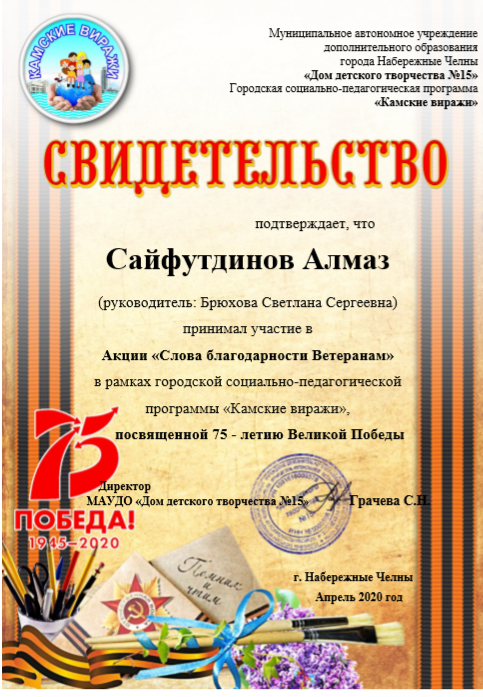 Опубликовано: 29.04.2020Ученик 5В класса Сайфутдинов А. принял участие в городской социально-педагогической программе «Камские виражи», акция «Слова благодарности Ветеранам».