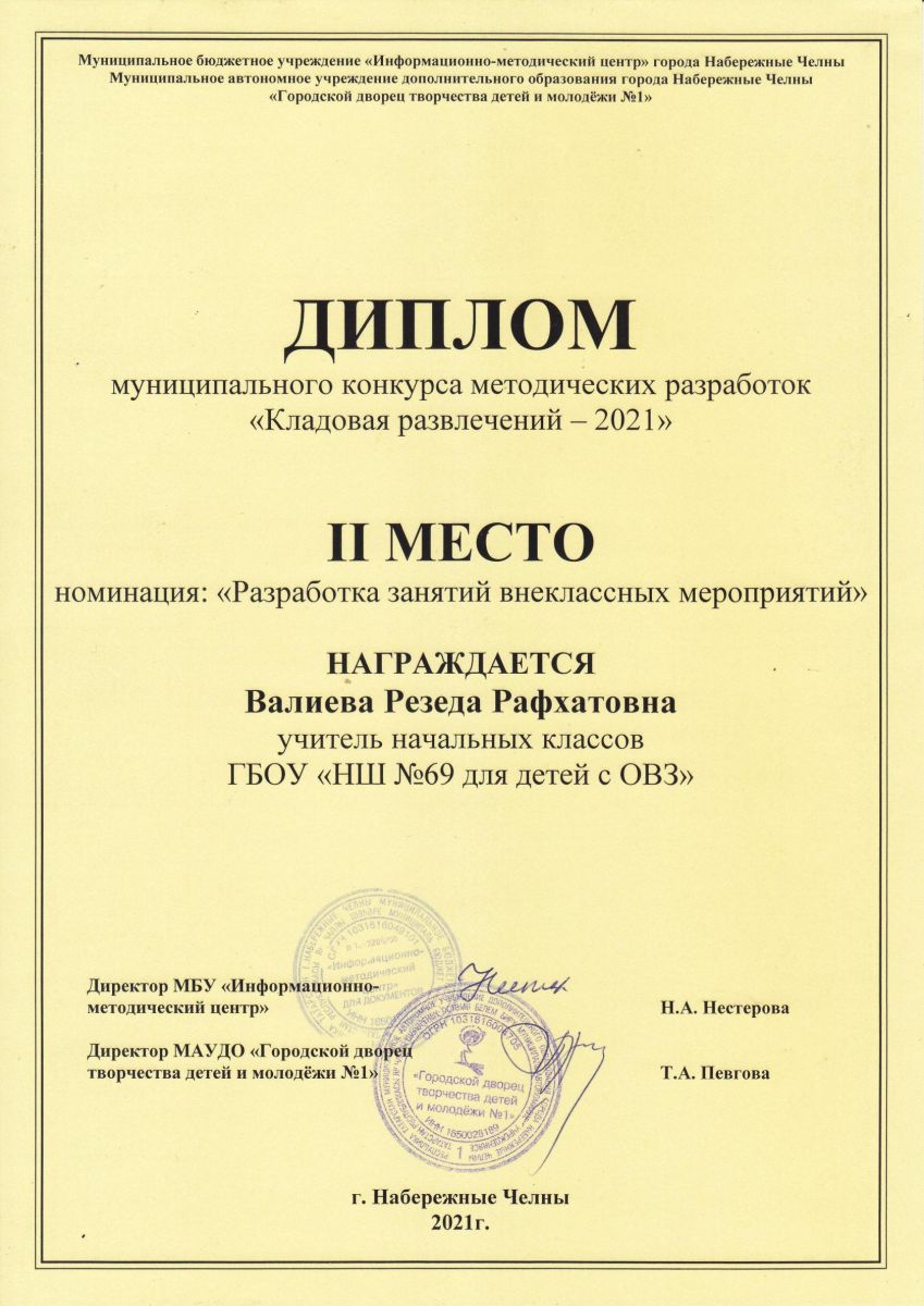 Учитель начальных классов Валиева Резеда Рафхатовна стала победителем в номинации «Разработка занятий внеклассных мероприятий» и была награждена дипломом за 2 место.