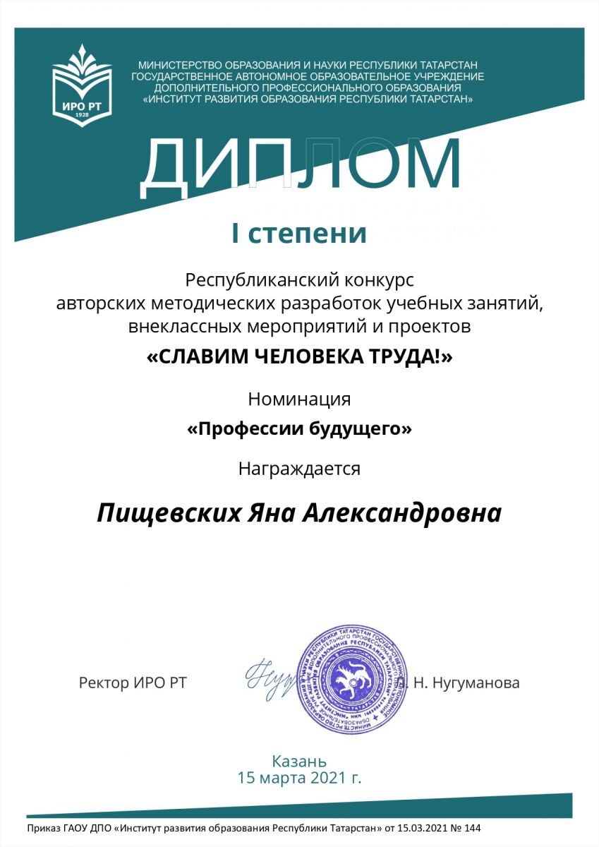 Опубликовано: 16.03.2021Педагоги нашей школы приняли участие в республиканском конкурсе авторских методических разработок учебных занятий, внеклассных мероприятий и проектов «Славим человека труда!», прошедшего с 11 января по 15 марта 2021 года в соответствии с приказом Института развития образования Республики Татарстан от 11.01.2021 № 1.