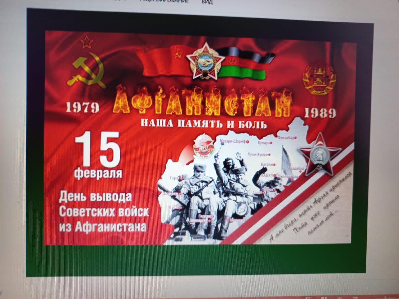 Опубликовано: 25.02.202224.02.2022 согласно плану мероприятий воспитательной работы в 6а и 7б классах педагогами Пищевских Я.А., Галялтдиновой Г.Ф. был проведён классный час, посвященный выводу Советских войск из Афганистана "Афганистан - наша память и боль".