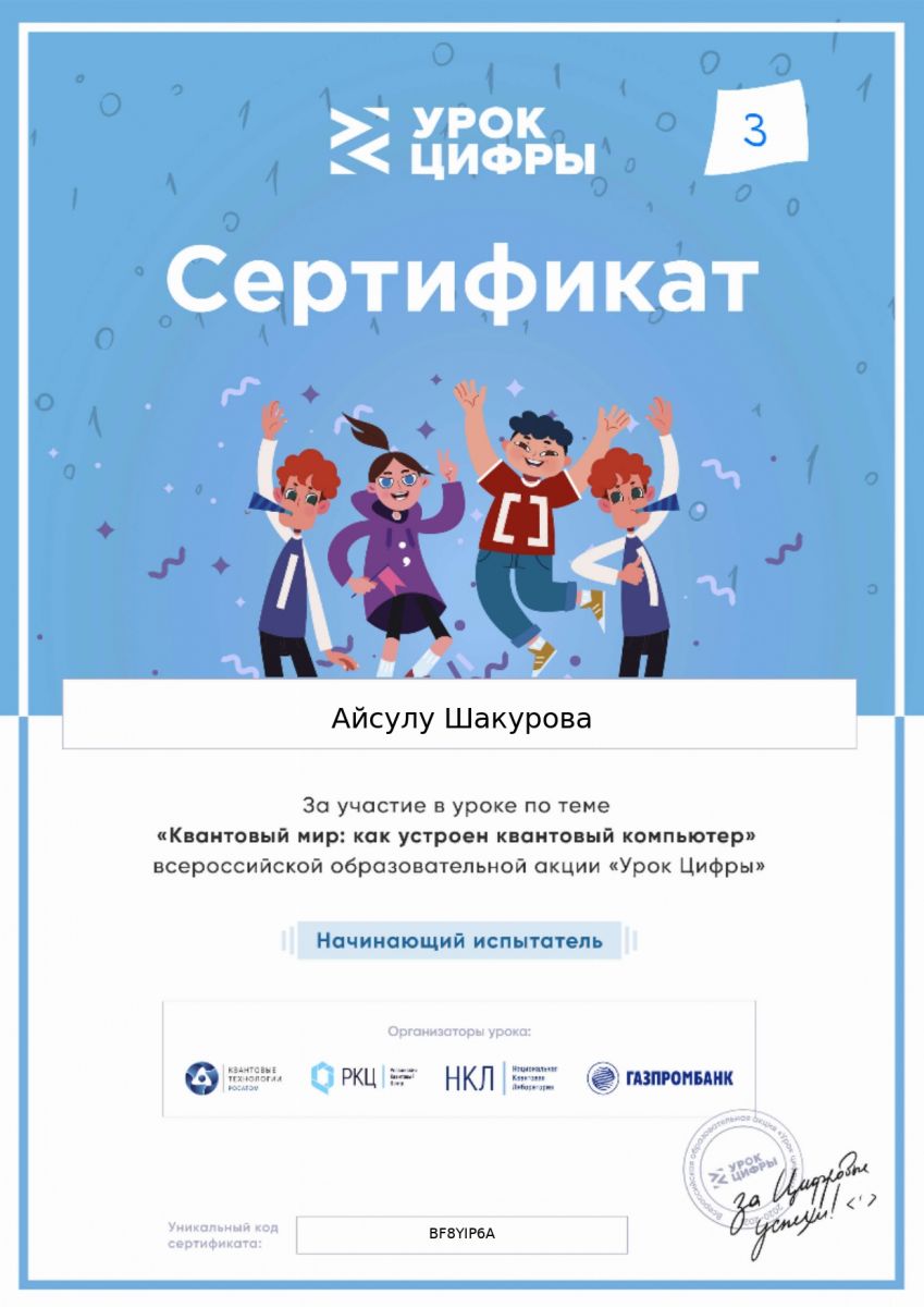 Всероссийский образовательный проект в сфере информационных технологий №3 на тему "Квантовый мир: как устроен квантовый компьютер". На уроке все было квантовым: физика, технологии, компьютеры и даже профессии! Как это изменит нашу жизнь, или как самому стать квантовым учёным? После получения информации учащиеся успешно потренировались на тренажёре и получили сертификаты.