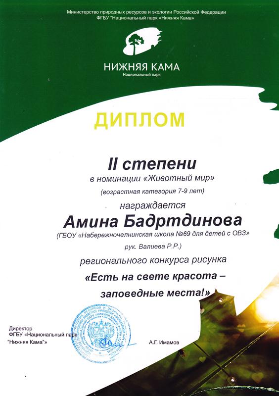 Целью конкурса являлось популяризация нового визит-центра в Боровецком лесу за городом Набережные Челны, привлечение внимания подрастающего поколения к сохранению природного наследия, к проблемам сохранения флоры и фауны национального парка «Нижняя Кама». На конкурс были представлены работы из Елабуги и Набережных Челнов - всего 150 работ. Из них обучающаяся нашей школы Бадртдинова Амина получила диплом II степени в номинации «Животный мир».
