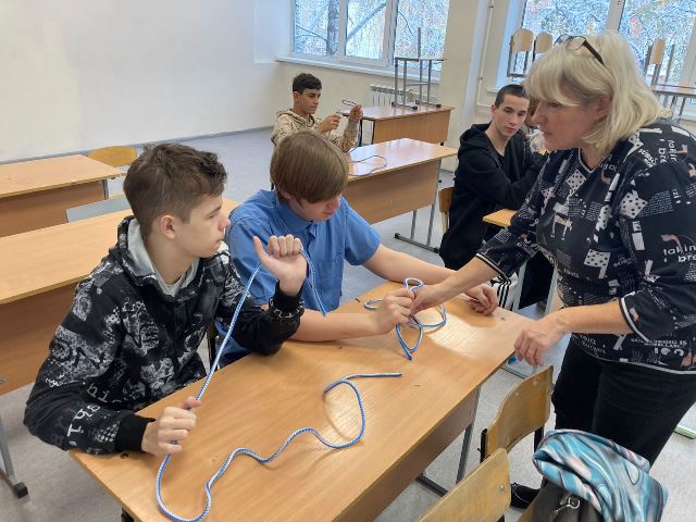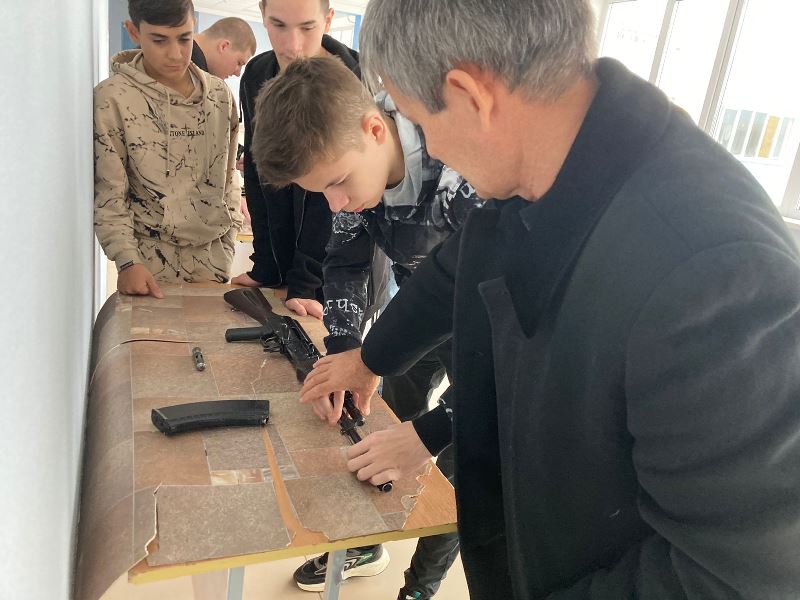 Дети учились завязывать узлы, разбирать и собирать автомат Калашникова, просмотрели фильм о Калашникове М.Т. и сыграли в игру «Вопрос-ответ» про просмотренному фильму.