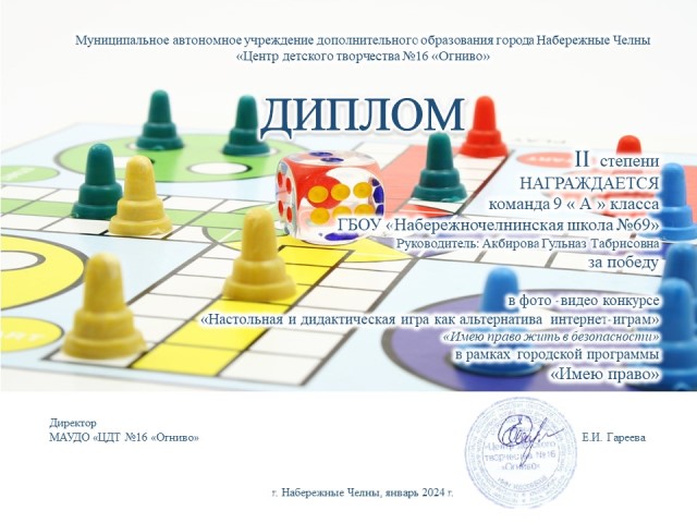 Опубликовано: 26.02.2024В январе 2024 года обучающиеся 9а класса под руководством педагога Акбировой Г.Т. приняли активное участие в конкурсе фото и видео «Настольная и дидактическая игра как альтернатива интернет-играм» («Имею право жить в безопасности!») в рамках городской программы «Имею право». По итогам конкурса команда награждена дипломом за II место.