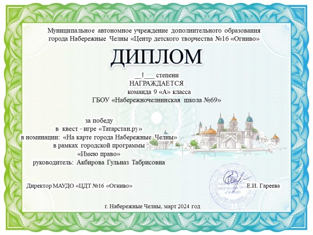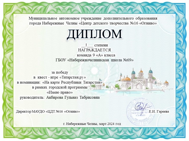 Опубликовано: 13.05.2024В феврале 2024 года обучающиеся 9а класса под руководством педагога Акбировой Г.Т. приняли активное участие в квест-игре на карте Республики Татарстан и города Набережные Челны «Татарстан.ру» в рамках городской программы «Имею право». Подведены долгожданные итоги. Команда 9а класса награждена двумя дипломами за I место. Молодцы!
