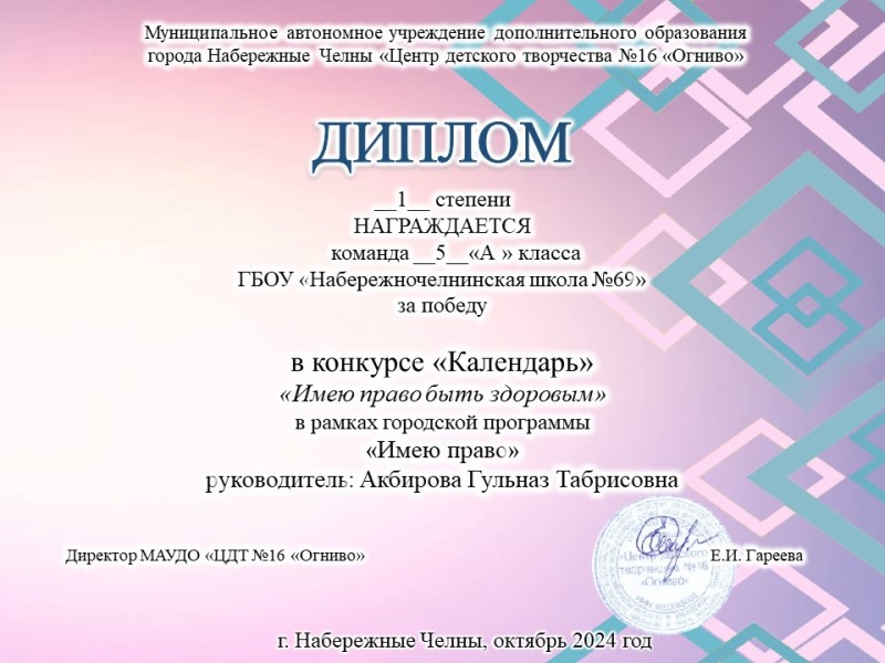 Опубликовано: 12.11.2024В октябре 2024 года обучающиеся 5а класса под руководством педагога Акбировой Г.Т. приняли активное участие в конкурсе «Календарь» («Имею право быть здоровым!») в рамках городской программы «Имею право». Подведены итоги мероприятия. Команда 5а класса награждена дипломом за I место.
