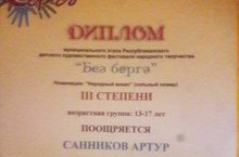 25 марта в ГДТДиМ №1 прошел гала-концерт муниципального этапа республиканского детского художественного фестиваля народного творчества "Без бергэ". Ученик 9 класса Санников Артур был награжден дипломом 3 степени.