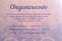 5а сыйныф укучысы Олейник Анна Республика буенча үткәрелгән «Навстречу Сочи-2014» иҗади конкурсында катнашуга ия булды.