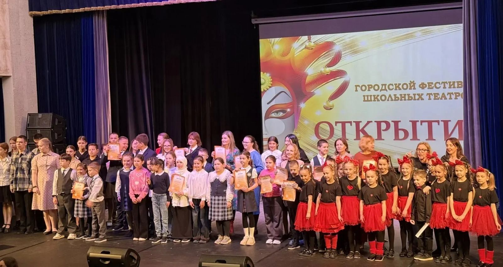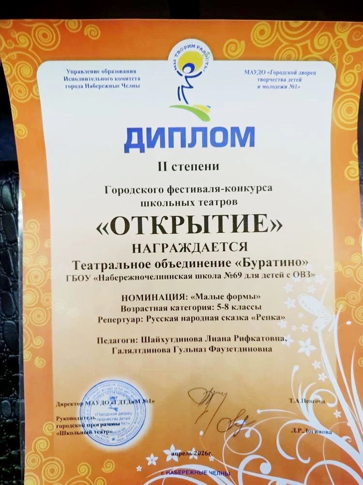 Участие в городском фестивале школьных театров "Открытие" (апрель 2026) Диплом Фото1 Фото2