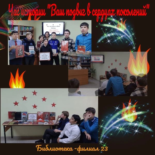 Опубликовано: 17.05.202317 мая в библиотеке-филиале №23 прошел час истории "ВАШ ПОДВИГ В СЕРДЦАХ ПОКОЛЕНИЙ".