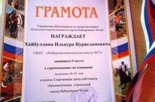 По итогам соревнований учитель физической культуры нашей школы Хайбуллин Ильнур Нурисламович занял I место, ему была вручена грамота Управления образования и по делам молодежи Исполнительного комитета г. Набережные Челны.