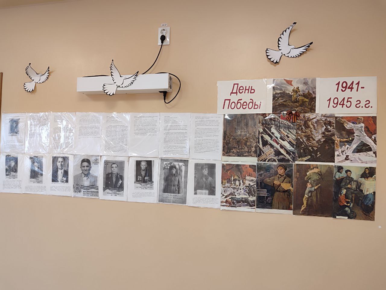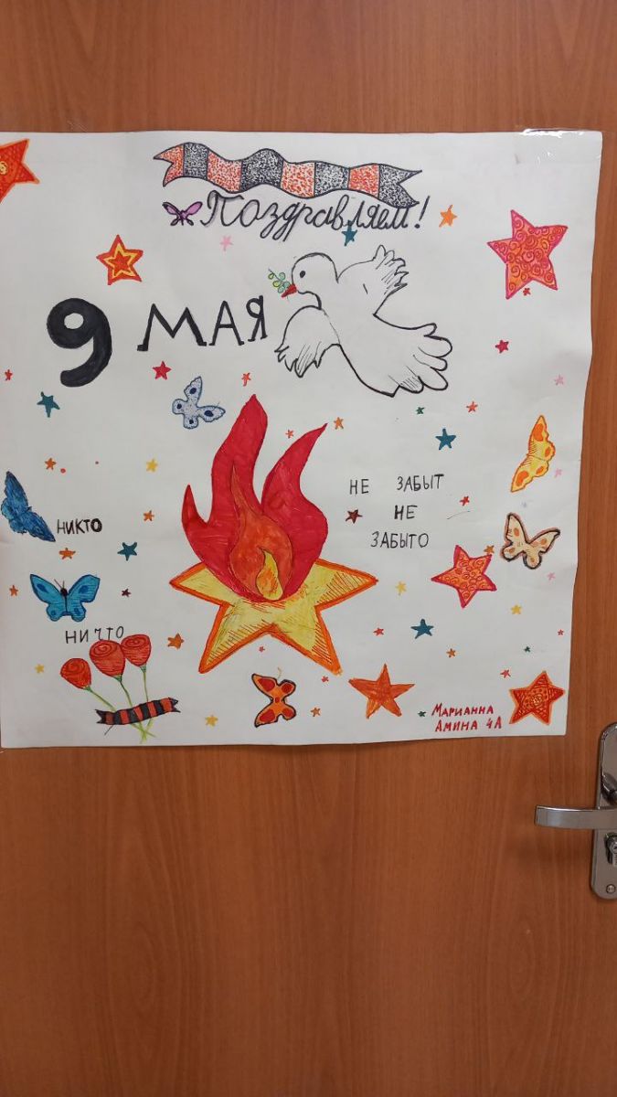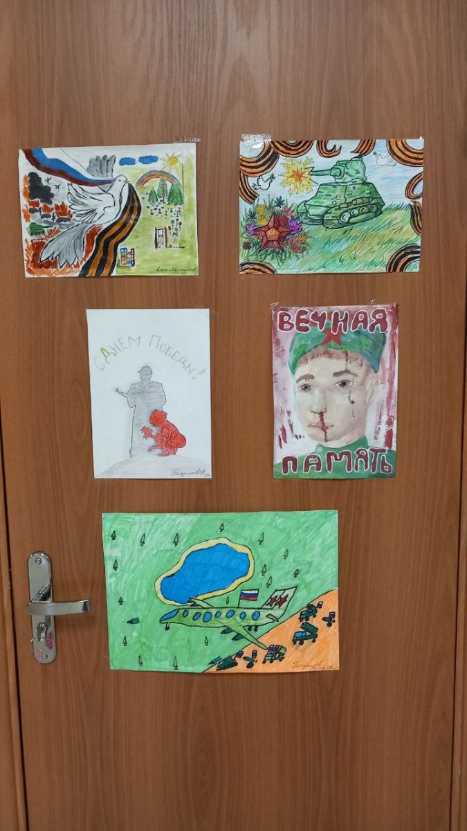 В преддверии великого праздника Дня Победы в школе прошла выставка детских рисунков «Этот день Победы». Учащиеся представили работы, в которых показали свое видение великого праздника – Дня Победы. В основном дети изображали мирное время: салют в честь 9 Мая, цветы, георгиевские ленточки. Детские рисунки о войне – это продолжение памяти о наших дедах, это благодарность за нашу жизнь. Была оформлена выставка книг "Помните через года,через века...", приняли участие в акции "Моя семья причастна к той Победе!"